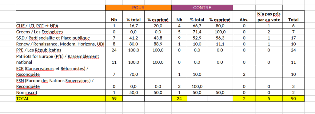 Deux groupes ont voté à 100 % pour le texte : le Parti populaire européen (Les Républicains) et les Patriotes pour l’Europe (Rassemblement national).