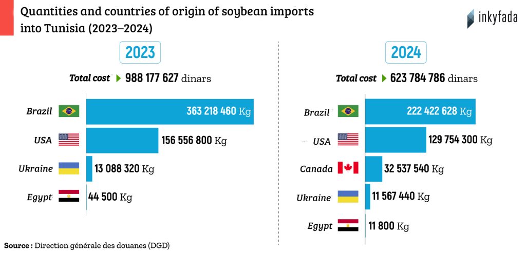 Tunisia already imports large quantities of soybeans – nearly 400,000 tonnes in 2024 – mainly from Brazil, the United States and Argentina, where more than 95% of soybeans grown are genetically modified, making it highly likely that imported soybeans are GMOs.