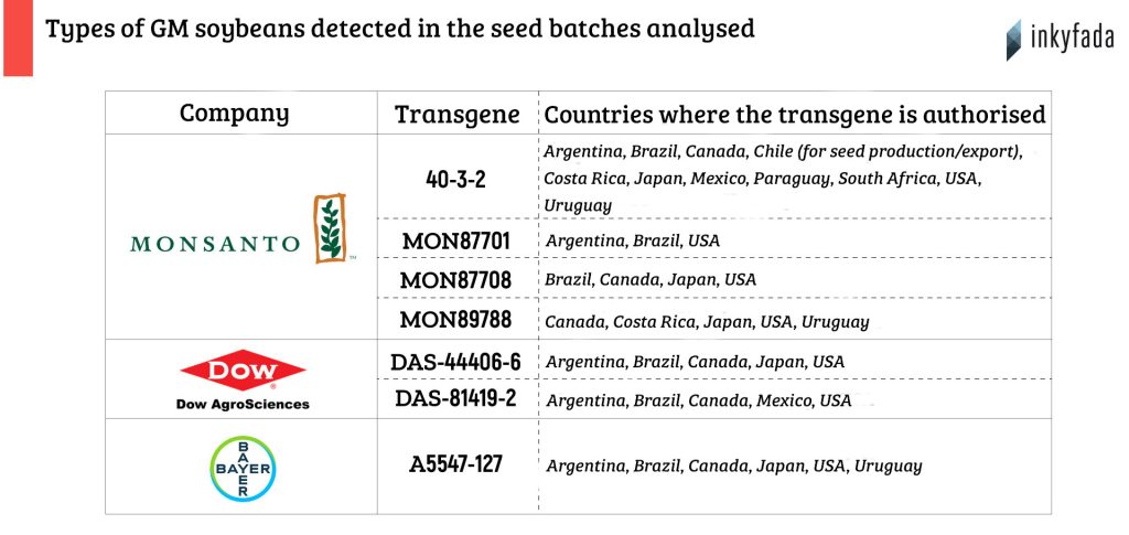 The first analysis, carried out in Tunisia, confirms the transgenic nature of these batches. The second, carried out in France, identifies the modifications more precisely and determines that the soybean samples harvested are tolerant to several herbicides (glyphosate, glufosinate-ammonium, 2, 4-D and dicamba) and produce several insecticides against lepidoptera (butterflies). These transgenes belong to several multinational biotechnology companies: Monsanto (Bayer), BASF and Dow AgroSciences.