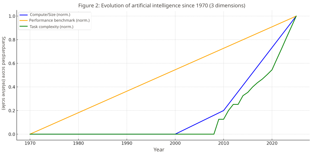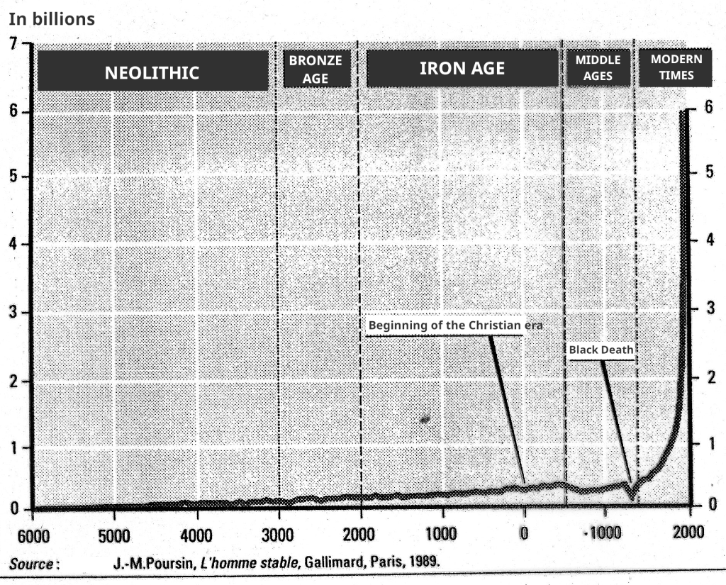 The framework for this discussion is based on the evolution of Western culture or civilisation (globalised, which is important). In order to represent it quantitatively on a graph, discrete parameters are requirediv. We can use very significant and structuring technological developments, such as the power of microprocessors (Fig. 1) or artificial intelligence (AI) (Fig. 2), or the evolution of a global result of technological development such as demographics (Fig. 3). Broadly speaking, and this will come as no surprise to anyone, this evolution is roughly exponential. This means that after a very long period of very little change (on a global scale), there is a phase of very rapid growth, which tends towards infinity. We are at the point on the curve where the rate of growth is enormous and where even a tiny advance in time leads us to infinity, which is clearly unreachable. This fact has been highlighted by many people, but has not been taken into account by decision-makers (nor by most NGOs, for that matter…). Yet it clearly means that the cultural engine of this civilisation (once again, globalised) is inevitably crumbling. It can be shown that this process of crumbling is already underway.
