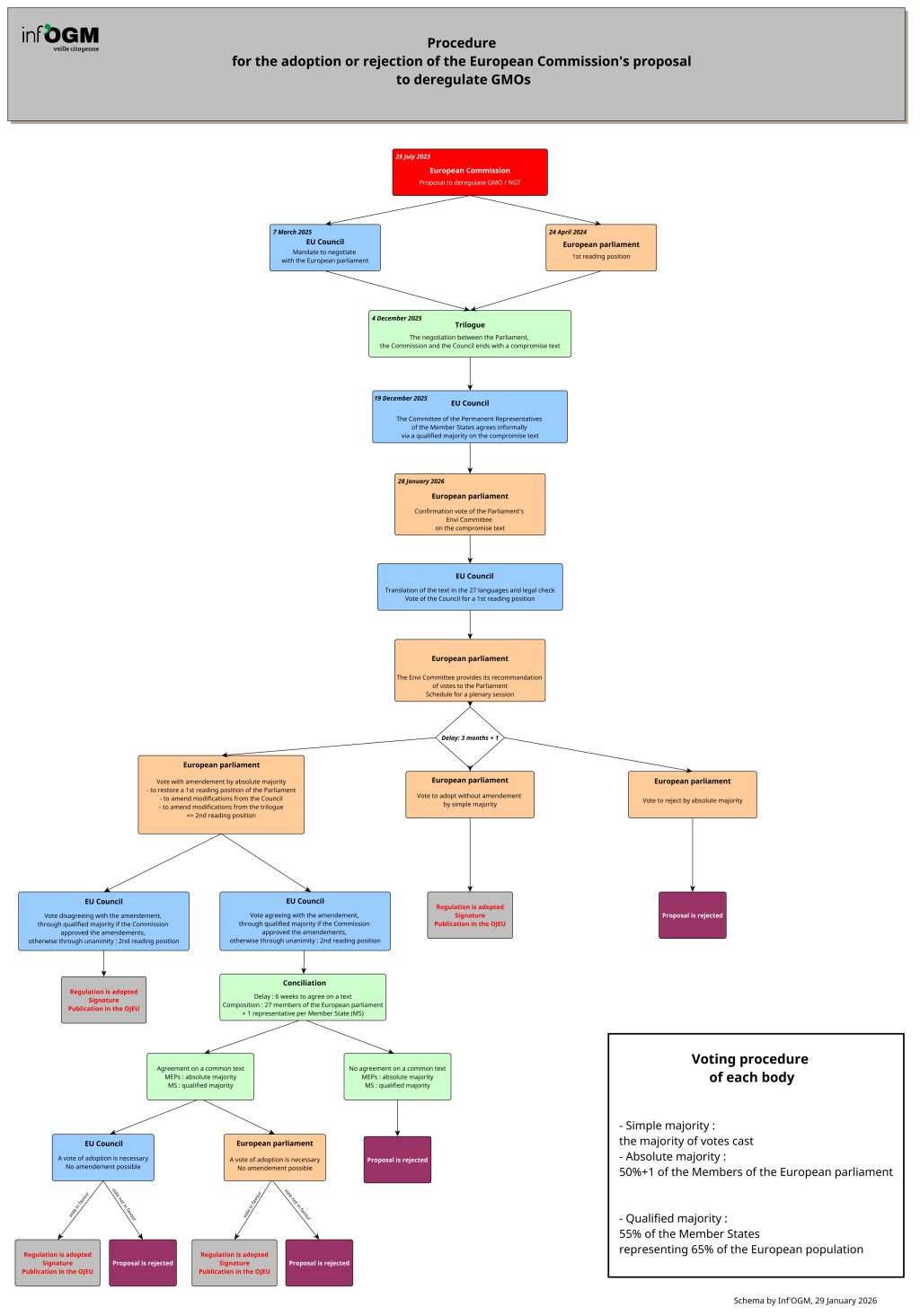 Focusing on the work currently underway on the possible deregulation of many GMOs (with key dates already set for the stages that have been completed), Inf’OGM has outlined below the step-by-step procedure for the adoption or rejection of European legislation. For a better view of the diagram, you can click on the image. You can also open and download this diagram in PDF format by clicking here.