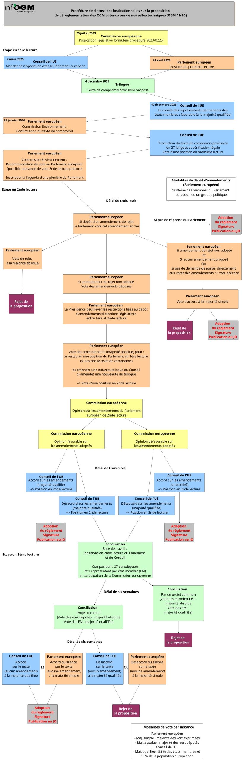 Axé sur le travail en cours concernant une possible déréglementation de nombreux OGM (avec donc des étapes déjà franchies pour lesquelles les dates clefs ont été indiquées), Inf’OGM a schématisé ci-dessous la procédure suivie, étape par étape, en vue de l’adoption ou du rejet d’un texte législatif européen. Pour une meilleure lecture du schéma, vous pouvez cliquer sur l’image. Vous pouvez également ouvrir et télécharger ce schéma au format PDF en cliquant ici.